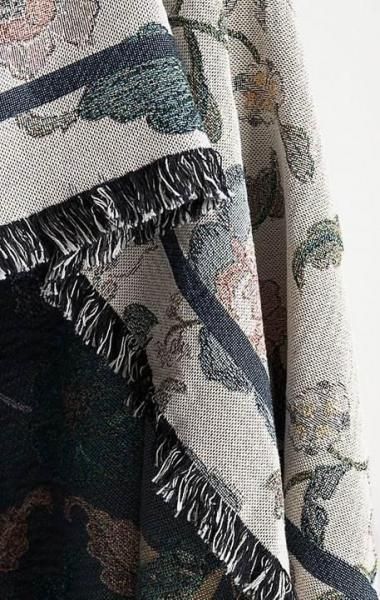 動植物が織りなす幻想的な風景が描かれた、綿100%のスロー。どんな空間にもぴったりのアクセントテキスタイルです。