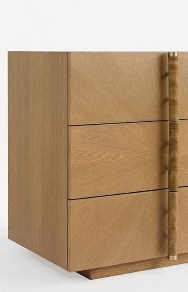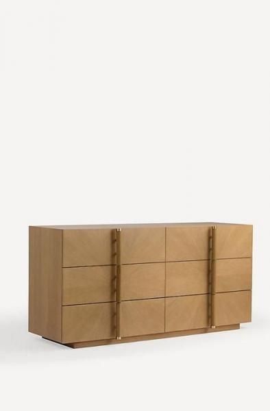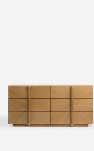 Hugoドレッサーは、シンメトリーなパネル、凹型の台座、そして十分な収納スペースを備えたモダンなデザインが特徴です。