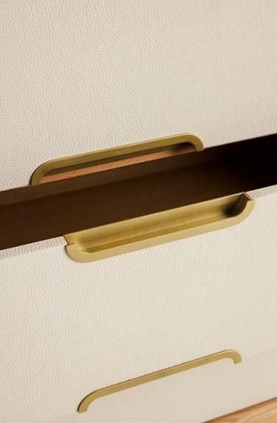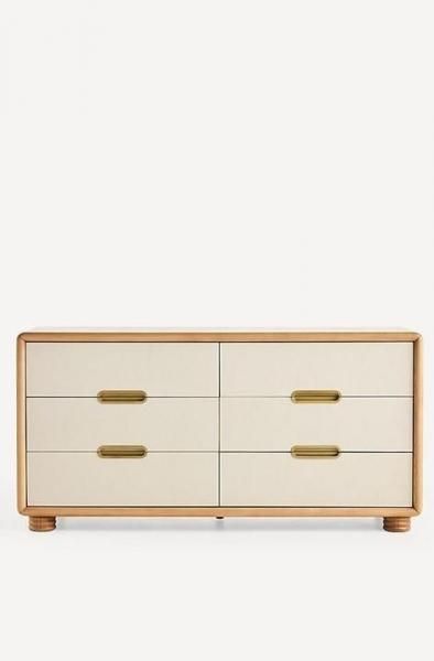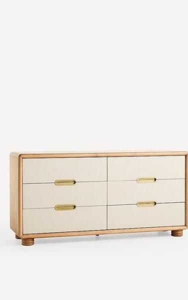 アッシュ材とポプラ材を使用したドレッサー。アッシュ突板とオクメ突板のバックパネル付き。MDFとレザーを使用し、アッシュ突板で仕上げたソフトクローズ式の引き出しが6つ。
