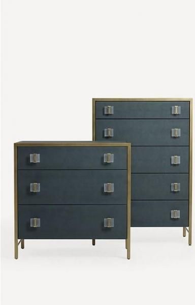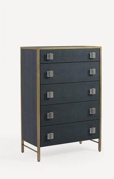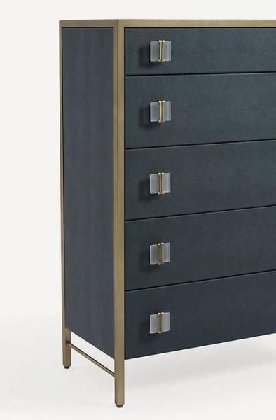 シーグラスのハンドルとスチール製の金具を備えた、エンジニアードハードウッドとシャグリーンのドレッサー。金属製のスライドレールで開閉する5つの引き出し。柔らかい布で拭いてください。化学洗剤の使用は避けてください。