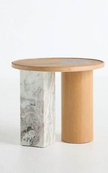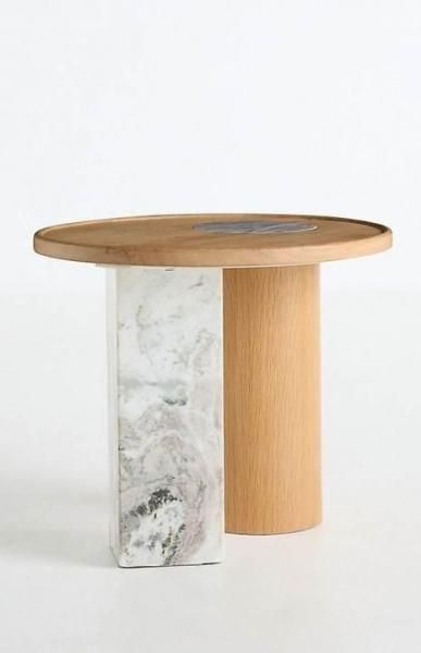 大理石のフレームとアイアン製の金具を備えたオーク材のサイドテーブル