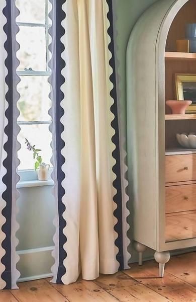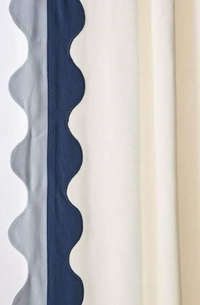 遊び心のあるスカラップ模様のトリムで縁取られたこのカーテンは、クリーンなコットンツイル素材で仕立てられており、どんなインテリアにも鮮やかな色彩と洗練された雰囲気を添えます。ハリのある質感の生地と魅力的なデザインは、プレッピーでモダンな空間にぴったりです。