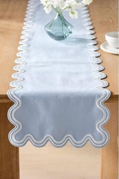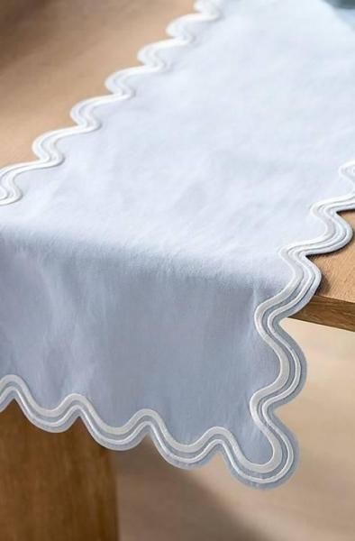 スカロップ模様の刺繍が施されたこのテーブルランナーは、テーブルに明るい魅力を添えます。