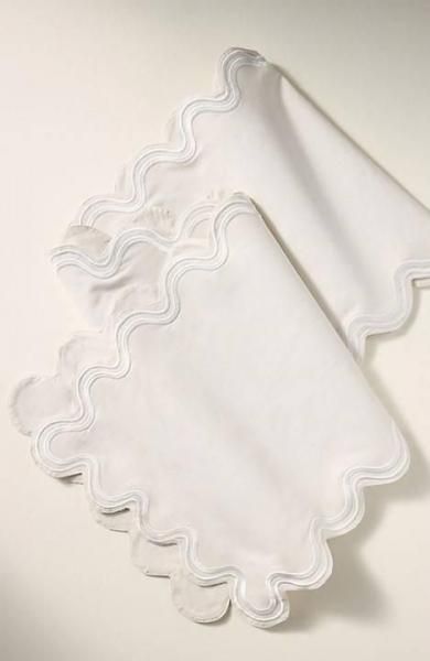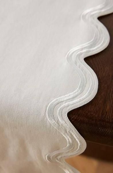 スカロップ模様の刺繍が施されたこのテーブルランナーは、テーブルに明るい魅力を添えます。