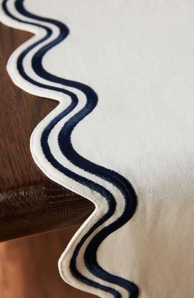 スカロップ模様の刺繍が施されたこのテーブルランナーは、テーブルに明るい魅力を添えます。