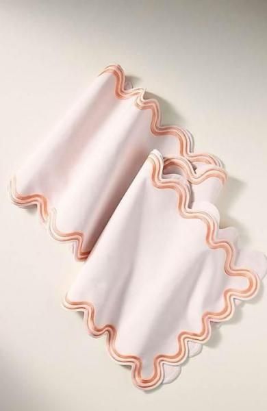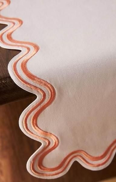 スカロップ模様の刺繍が施されたこのテーブルランナーは、テーブルに明るい魅力を添えます。