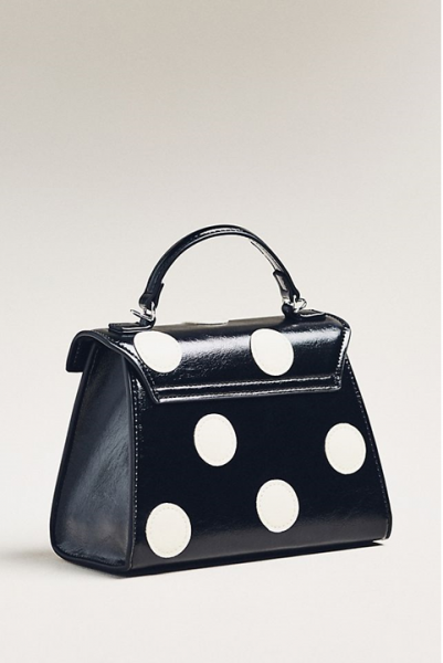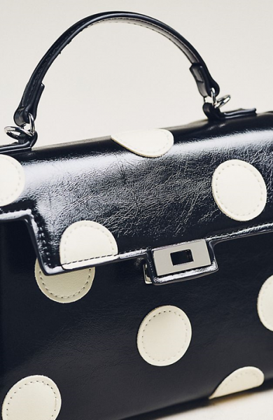 Melie Bianco Maiselバッグは、遊び心のあるドット柄、トップハンドル、取り外し可能なクロスボディストラップが特徴です。