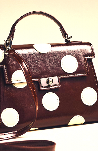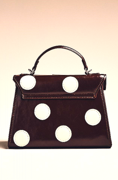 Melie Bianco Maiselバッグは、遊び心のあるドット柄、トップハンドル、取り外し可能なクロスボディストラップが特徴です。