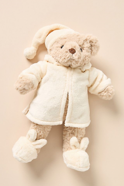 Briar Bedtime Bearは、おやすみ前のお供にぴったり。遊び心のあるナイトキャップ、心地よいローブ、そして愛らしいウサギのぬいぐるみスリッパが、素敵な夜のルーティンを演出します。
